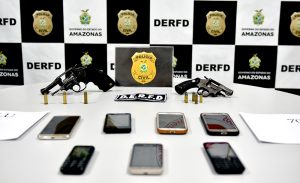 A Polícia Civil do Amazonas, representada pelo delegado-geral adjunto da instituição, Orlando Amaral, e pelos delegados Guilherme Torres e Demetrius Queiroz, titular e adjunto, respectivamente, da Delegacia Especializada em Roubos, Furtos e Defraudações (Derfd), falou, na manhã desta sexta-feira (11/01), durante coletiva de imprensa realizada às 11h30, no prédio da Derfd, sobre as prisões, em flagrante, de cinco indivíduos por roubo majorado tentado e participação em organização criminosa. Com os infratores foram apreendidos dois revólveres e munições.