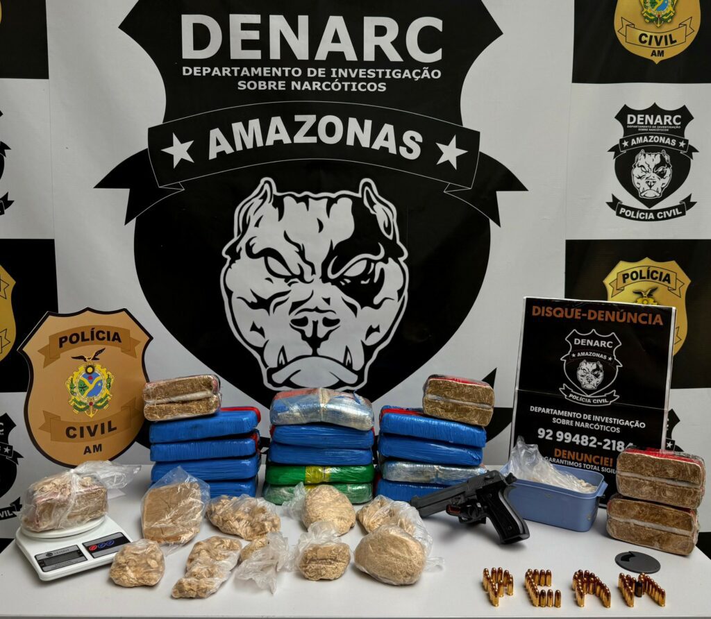 A Polícia Civil do Amazonas (PC-AM), por meio do Departamento de Investigação sobre Narcóticos (Denarc), apresentou nesta segunda-feira (1°/09) a prisão em flagrante de um homem de 35 anos, com cerca de 20 quilos de cocaína, avaliados em R$ 1,5 milhão. Também foram apreendidos uma pistola, munições e veículos. A ação aconteceu na sexta-feira (29/08), na rua José Reis, bairro Novo Israel, zona norte de Manaus.