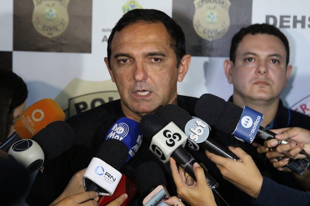 Os delegados Paulo Martins e Charles Araújo, respectivamente, titular e adjunto da Delegacia Especializada em Homicídios e Sequestros (DEHS), falaram na manhã desta quarta-feira (09/10), durante coletiva de imprensa realizada às 11h, no prédio da especializada, sobre o cumprimento do mandado de prisão preventiva por duplo homicídio e tentativa de homicídio, em nome de Lucas Costa Figueiredo, 20, conhecido como “Luquinha”.