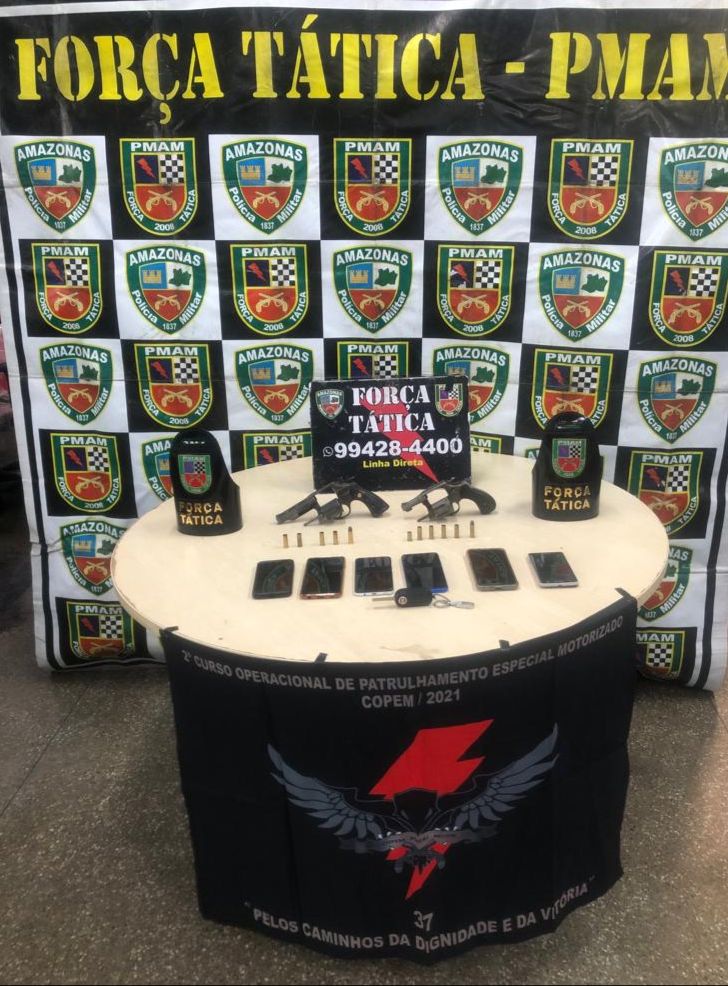 Policiais militares da Força Tática, na tarde da ultima sexta-feira (17/12), apreenderam armas, munições e objetos roubados durante uma ocorrência, na rua Dr. Waldir Centauro, bairro Zumbi 2, zona leste de Manaus.