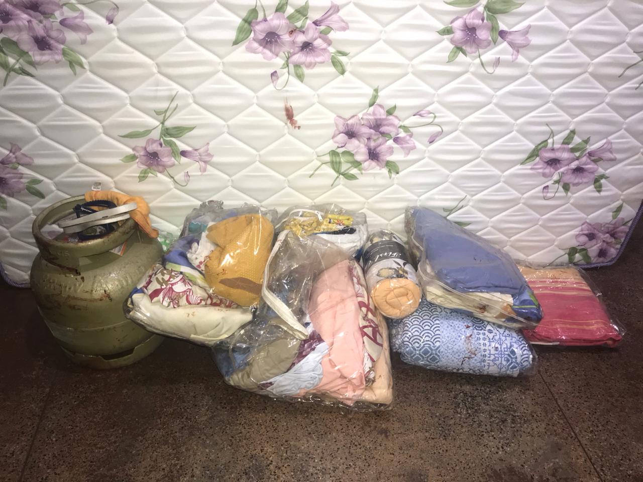 Seguindo os rastros, os policiais chegaram a uma estância no outro lado da rua, onde fizeram contato com a proprietária, que autorizou buscas no imóvel. O suspeito foi encontrado no local, juntamente com os objetos roubados, que incluíam um colchão de solteiro, uma botija de gás, um edredom, sete jogos de cama e um par de sandálias. Os itens apreendidos foram conduzidos até a delegacia e depois devolvidos à vítima, um homem de 43 anos.