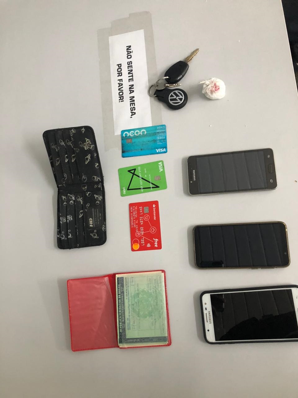 Os policiais se deslocaram até a avenida Ayrão, onde avistaram um veículo com as mesmas características repassadas na denúncia. Após abordagem ao veículo e revista nos ocupantes, foram encontrados os celulares e a porção de supostamente entorpecente apreendidos.