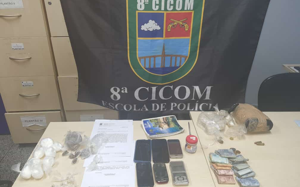 Segundo os militares, os dois indivíduos foram flagrados com um tablete de cor verde, dez trouxinhas semelhantes a oxi, oito porções de substância com aspecto de cocaína e sete com característica de maconha, cinco celulares, quatro munições, além de um animal silvestre e dinheiro.