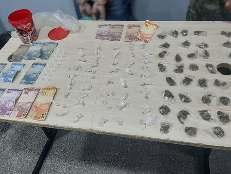 Na revista pessoal, foram apreendidas 38 trouxinhas de substância com aspecto de maconha tipo ‘skunk’, 44 trouxinhas de substância com aspecto de Oxi, e 17 pinos de substância com característica de cocaína.
