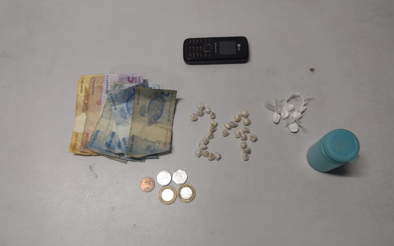 As equipes das viaturas 6350 e 6356 realizaram incursão no beco Afonso Pena, no Centro, após recebimento de denúncias anônimas sobre tráfico de drogas no local. Ao adentrar a via, avistaram o suspeito, que ainda tentou fugir da abordagem, sem sucesso. Com ele foram encontrados R$ 51,80 em espécie e um aparelho celular. Em buscas próximo do local onde o suspeito estava, foram encontradas 27 porções de substância semelhante a oxi e cinco porções de entorpecentes análogas a cocaína.