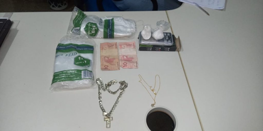 Após abordagem e revista pessoal, foram encontradas com um deles duas porções grandes de substância entorpecente. No local, foram apreendidos uma balança de precisão, dois pacotes de sacos plásticos e R$ 20,00 em espécie.