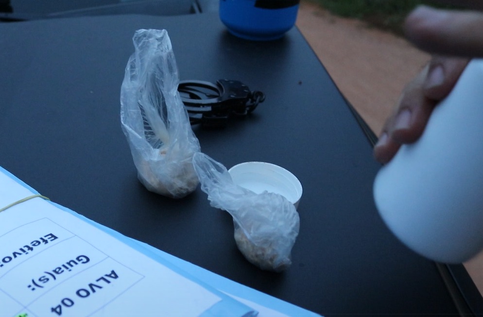 Os policiais foram ao local e abordaram um suspeito em frente à residência dele. Com ele foi encontrada uma porção pequena de possivelmente cocaína. Ao ser questionado sobre o entorpecente, ele não negou estar traficando e mostrou onde estava o restante do material e da droga, que estava escondido no forro da casa.