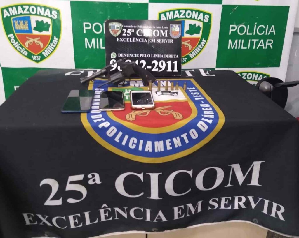 Com o homem foi encontrado um revólver calibre 38 com numeração aparente, com uma munição deflagrada, quatro repercutidas e uma intacta, além de três aparelhos celulares roubados. O caso foi encaminhado para o 14° Distrito Integrado de Polícia (DIP).