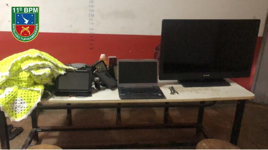 A equipe policial conseguiu recuperar os seguintes materiais: uma TV de 32 polegadas; um Notebook; um Tablet HP; um Dvd; um roteador; um ventilador; uma bolsa; dois painéis eletrônicos; dois refletores de Luz; um perfume; um Shampoo Baby Johnson; um terçado; seis tapetes; três chaves de ferramentas diversas.