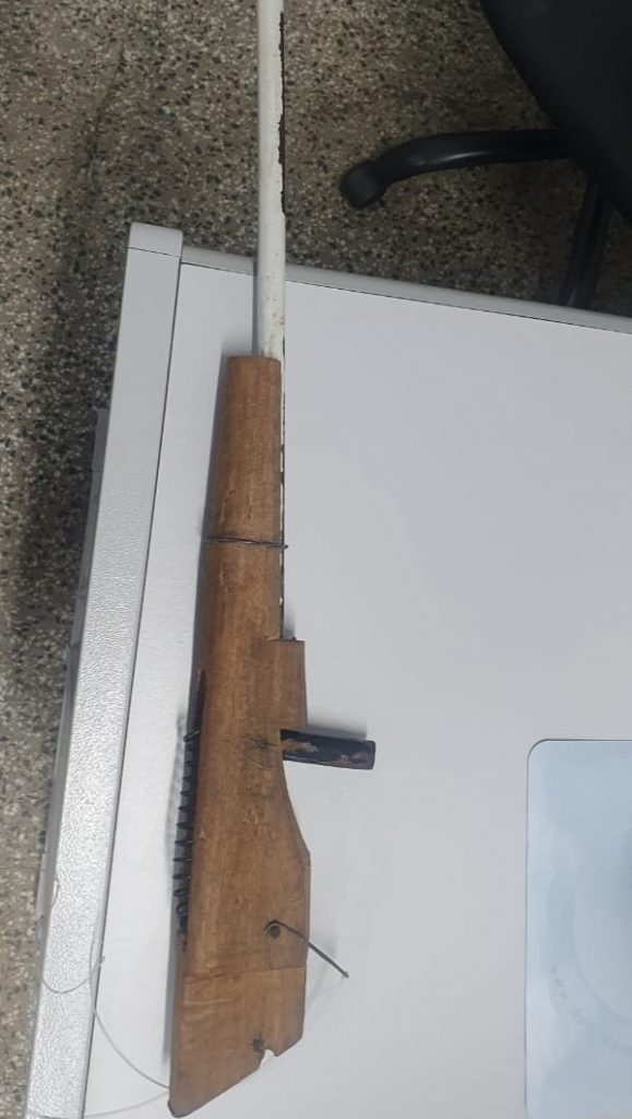 Diante disso, a guarnição foi acionada imediatamente. Chegando ao endereço informado, os policiais não encontraram nem o suspeito nem a criança, porém apreenderam a arma de fogo caseira utilizada no crime. Logo depois, a guarnição se deslocou até a rua Leão de Judá, bairro Jesus me Deu, onde encontrou o indivíduo que foi detido sem resistência alguma.