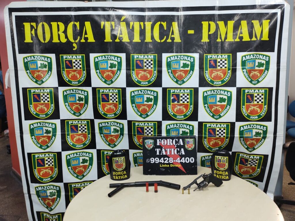 Policiais militares da Força Tática, na noite de sexta-feira (21/05), detiveram um homem, de 21 anos, por posse de armas e munições, na rua Ouro Preto, bairro Coroado 3, zona leste de Manaus.