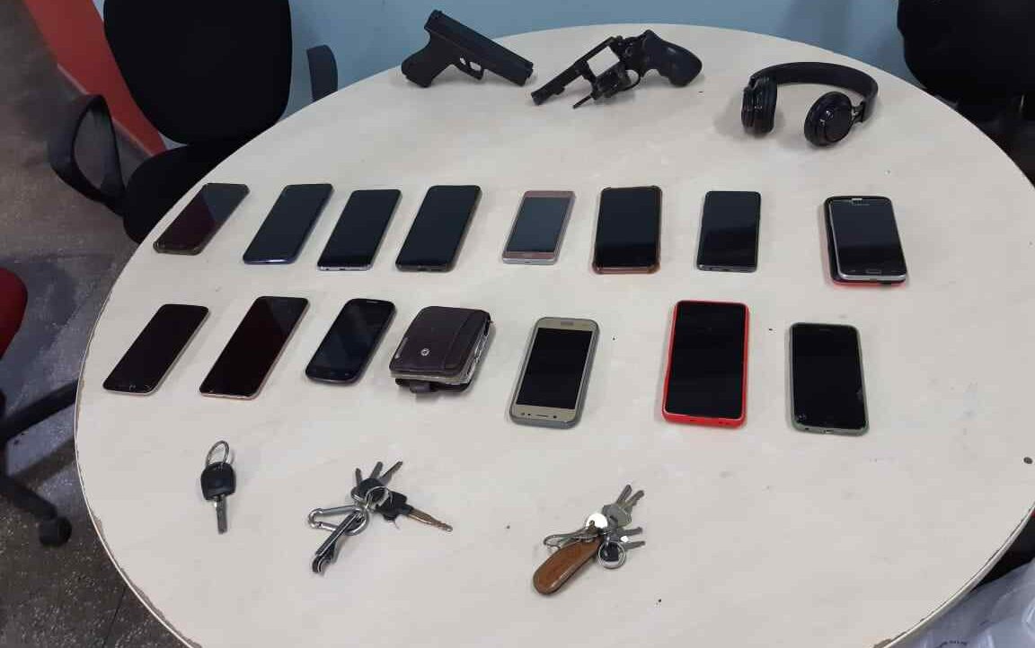 Os policiais detiveram um suspeito, alvejado com um disparo na perna direita, e com ele encontraram um revólver calibre 38 com três munições intactas e duas munições deflagradas, além de um simulacro tipo pistola, e mais 14 aparelhos celulares. Os outros dois suspeitos fugiram do local.
