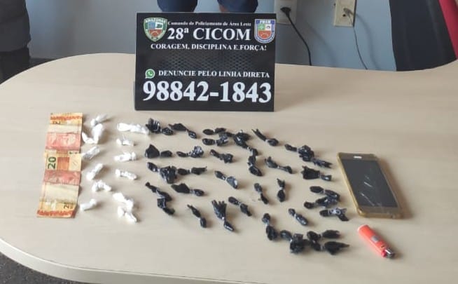 De acordo com os policiais, ao perceber a presença da viatura, o rapaz ficou nervoso e jogou uma bolsa plástica no chão. Na abordagem e revista pessoal a polícia encontrou com ele: um aparelho celular, um cordão com pingente de crucifixo, R$ 40,00 (quarenta reais) e uma trouxinha de, supostamente, maconha. Na bolsa, que o infrator tentou se livrar, a polícia encontrou 47 trouxinhas de, supostamente, cocaína.