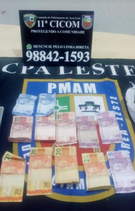 Foram encontradas duas porções médias de supostamente oxi e a quantia de R$ 129 em espécie.(FOTO: Divulgação/PMAM)