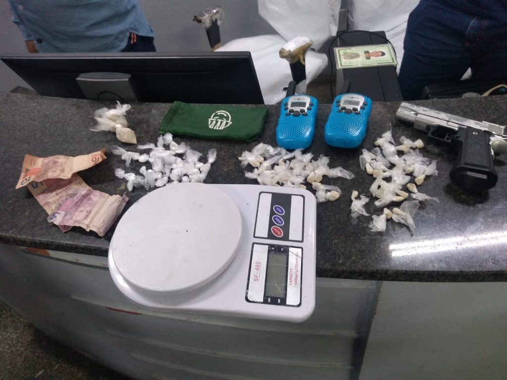 Após passar por vistoria, foram encontradas com o suspeito 25 trouxinhas supostamente de cocaína e 42 trouxinhas supostamente de oxi. O homem ainda confessou que, nas proximidades, outros materiais estavam escondidos. No local indicado, os policiais encontraram uma balança de precisão, um simulacro de arma de fogo do tipo pistola e outros itens.