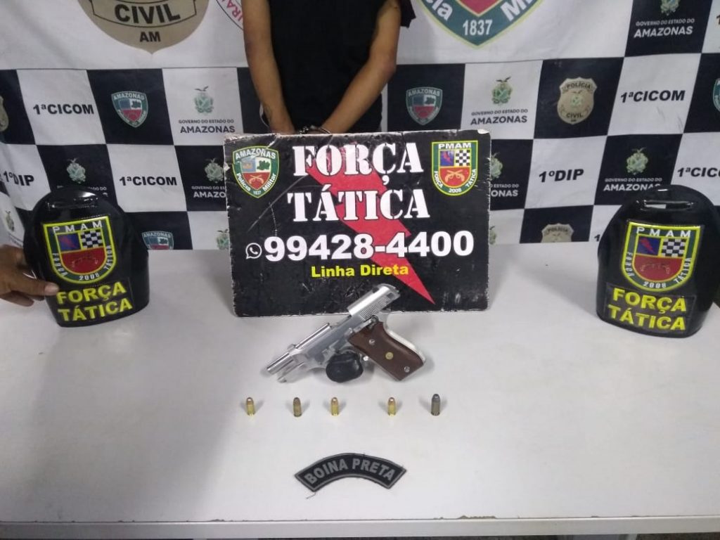 Policiais militares da Força Tática detiveram, na noite de quarta-feira (23), um homem de 27 anos suspeito de porte ilegal de arma de fogo no bairro Japiim, zona sul da capital. Com ele, os policiais apreenderam uma pistola calibre .380 de cor prata e marca Taurus, contendo cinco munições intactas.
