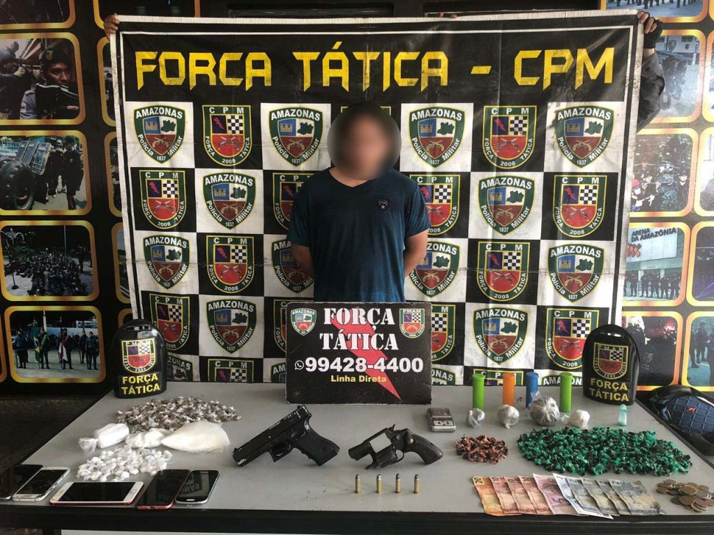 Policiais Militares da Força Tática detiveram, na tarde deste domingo (08/09), um homem de 29 anos, suspeito de porte ilegal de arma de fogo e tráfico de drogas no bairro Tancredo Neves, zona leste da capital. Com o suspeito, os policiais apreenderam um revólver calibre 38, marca Taurus, com numeração suprimida, quatro munições calibre 38 intactas, um simulacro de pistola, 284 kits contendo uma porção de supostamente oxi e outra de supostamente pasta base, 115 porções de supostamente maconha, 200g de supostamente maconha, 54 porções de supostamente cocaína, 250g de supostamente cocaína, 85g de supostamente oxi, uma balança de precisão e cinco aparelhos celulares de várias marcas e modelos.