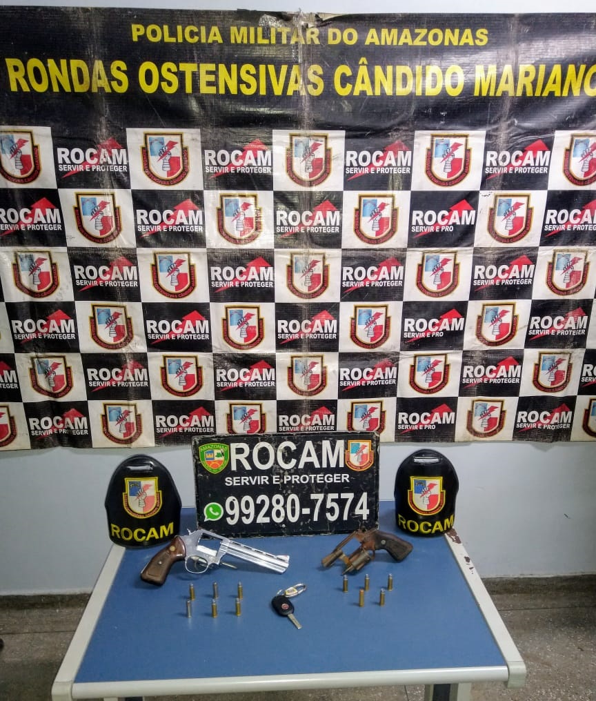 Policiais militares das Rondas Ostensivas Cândido Mariano (Rocam) detiveram, na noite desta segunda-feira (27/01), dois homens suspeitos de porte ilegal de arma de fogo e roubo no bairro Novo Aleixo, zona norte da capital. Com eles, os policiais apreenderam um revólver calibre 38, marca Taurus, numeração suprimida, um revólver calibre 38, marca Rossi, numeração suprimida, 11 munições, calibre 38, intactas, e um veículo modelo Mobi, placa NAY-7146, com restrição de roubo.