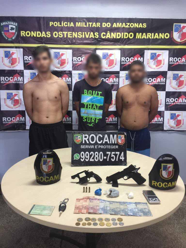Policiais militares das Rondas Ostensivas Cândido Mariano (Rocam) detiveram, na tarde desta segunda-feira (02/09), três homens suspeitos de porte ilegal de arma de fogo, tráfico de drogas e receptação no conjunto Mundo Novo, zona norte da capital. Com os suspeitos foram apreendidos um revólver calibre 32, um simulacro de pistola, uma porção média de supostamente maconha, uma porção média de supostamente oxi, uma porção média de supostamente cocaína, uma balança de precisão, um veículo modelo Palio Fire, cor preta e placas JUU-8894.