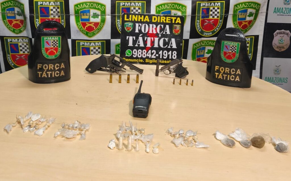 A Polícia Militar do Amazonas (PMAM), por meio da Força Tática, apreendeu duas armas de fogo, munições e mais de 40 porções de drogas, na segunda-feira (1°/12), no bairro Educandos, zona sul de Manaus.