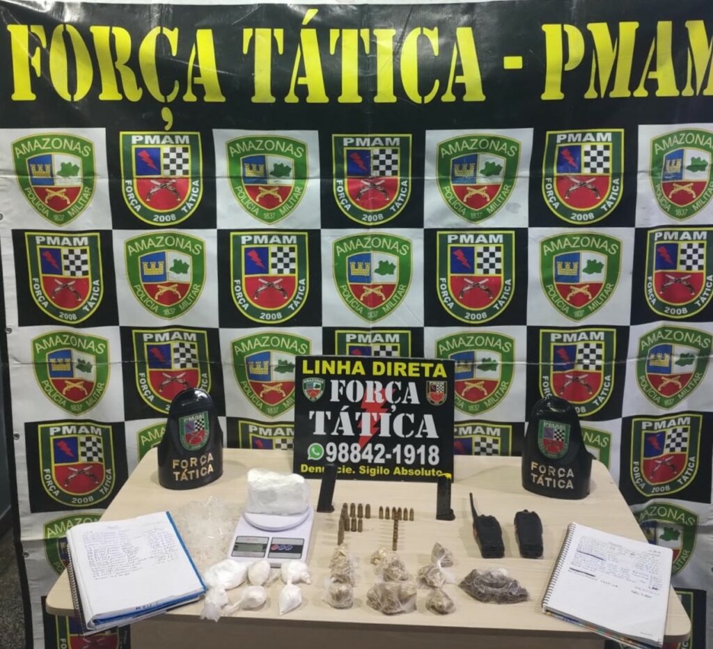 A Polícia Militar do Amazonas (PMAM), por meio da Força Tática, apreendeu entorpecentes, entre cocaína, oxi e skunk, na noite de sexta-feira (19/07), no bairro Lago Azul, zona norte de Manaus. Durante a ação policial também foram apreendidos carregadores, munições, rádios comunicadores, cadernos de contabilidade, balança de precisão e pinos para embalo do material ilícito.
