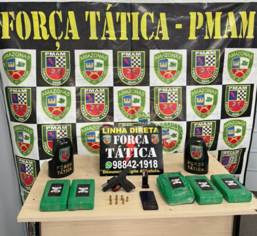 A Polícia Militar do Amazonas (PMAM), por meio da Força Tática, capturou um foragido da Justiça e apreendeu cinco tabletes de cocaína e arma de fogo, na tarde deste sábado (02/11), no conjunto Viver Melhor, zona norte de Manaus.