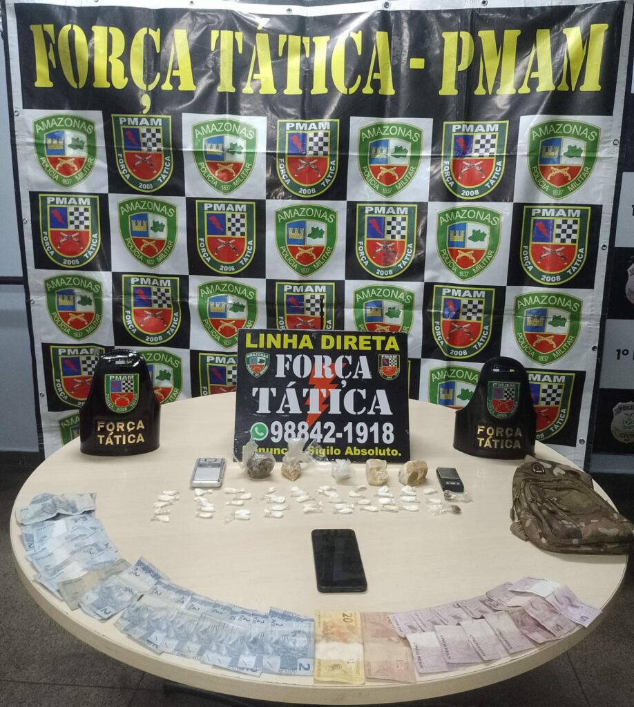 Suspeitos foram presos com entorpecentes, entre cocaína, maconha e oxi, além de balança de precisão, dinheiro e arma branca. FOTO: Divulgação/PMAM