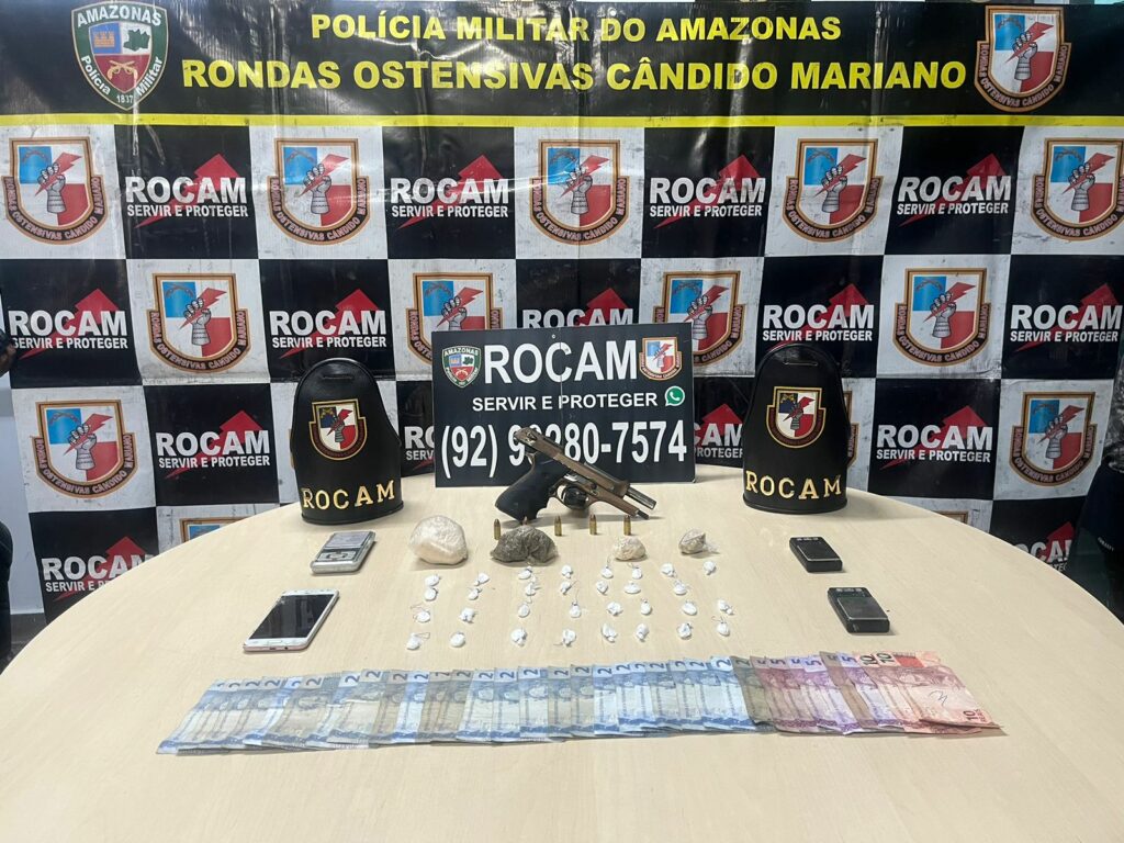A Polícia Militar do Amazonas (PMAM), por meio das Rondas Ostensivas Cândido Mariano (Rocam), efetuou a prisão de um homem, de 23 anos, pelo crime de tráfico de drogas e porte ilegal de arma de fogo, na quinta-feira (16/05). A ocorrência foi atendida na rua Quintino Bocaiúva, no Centro da cidade, zona sul.