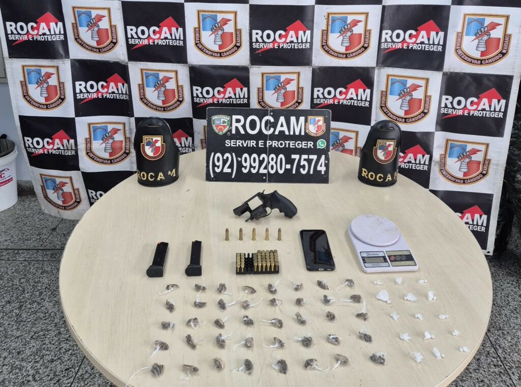 A Polícia Militar do Amazonas (PMAM), por meio das Rondas Ostensivas Cândido Mariano (ROCAM), prendeu um homem, de 20 anos, envolvido com o tráfico de drogas, na tarde desta segunda-feira (24/02), no bairro Tarumã Açu, zona oeste de Manaus. Com ele, foram apreendidos um revólver, munições, carregadores de pistola, porções de drogas, balança de precisão e um aparelho celular.