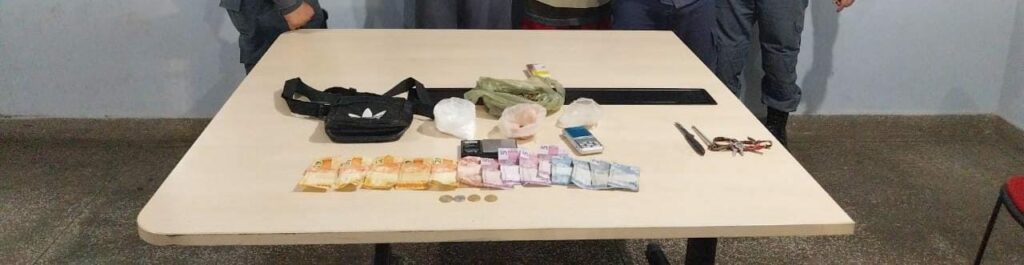 O jovem e o adolescente tentaram fugir quando perceberam a presença da viatura no local. Durante os procedimentos de busca pessoal, foram encontradas, uma porção de cocaína, uma de maconha, uma de oxi e uma de pasta base. Também foram apreendidos R$ 138 em espécie e uma balança de precisão.