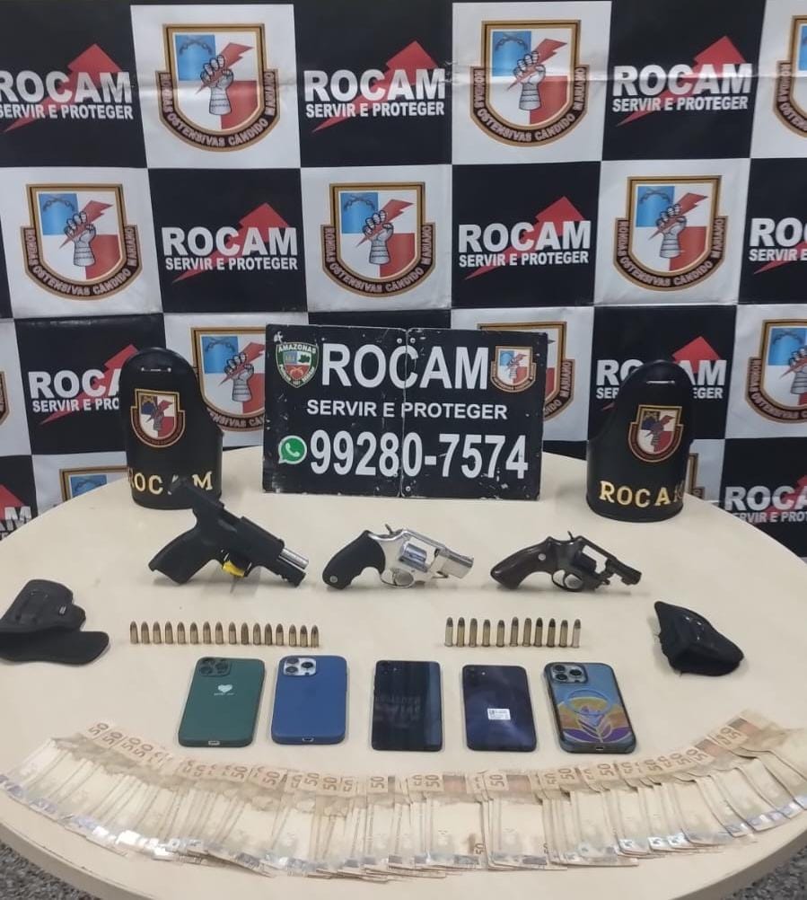 A Polícia Militar do Amazonas (PMAM), por meio das Rondas Ostensivas Cândido Mariano (Rocam), prendeu quatro homens, sendo um foragido da Justiça, na quarta-feira (27/11). A ação foi realizada em uma concessionária, no bairro Alvorada 1, zona centro-oeste, e resultou na apreensão de três armas de fogo.