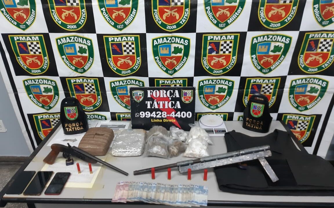 Policiais militares da Força Tática prenderam um homem de 21 anos no bairro Monte das Oliveiras, zona norte de Manaus. Durante patrulhamento pelo bairro, uma guarnição abordou o suspeito na rua Buritis, sendo encontrado com o cinco porções de maconha, 50 pequenas porções de merla e 111 pedras de oxi, além de três celulares, uma balança de precisão, um colete balístico, uma arma de fogo calibre 28, uma espingarda calibre 36, e seis munições de diferentes calibres. O infrator foi conduzido ao 19° Distrito Integrado de Polícia (DIP), onde foi autuado em flagrante por tráfico de drogas e porte ilegal de arma de fogo.