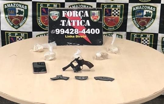Policiais militares da Força Tática detiveram, no início da noite desta quarta-feira (09/10), uma mulher de 22 anos, suspeita de tráfico de drogas e porte ilegal de arma de fogo no bairro Tancredo Neves, zona leste da capital. Com ela, os policiais apreenderam um revólver calibre 22, de numeração C.1863, e cinco porções médias de supostamente oxi.