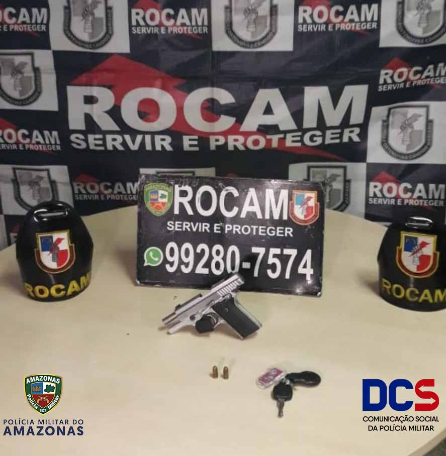 Policiais militares das Rondas Ostensivas Cândido Mariano (Rocam) detiveram, na tarde desta segunda-feira (07/10), um homem de 35 anos suspeito de porte ilegal de arma de fogo, no bairro Dom Pedro, zona centro-oeste da capital. Com ele, os policiais apreenderam uma pistola calibre 380, marca Taurus, numeração KAN22607, com duas munições intactas.