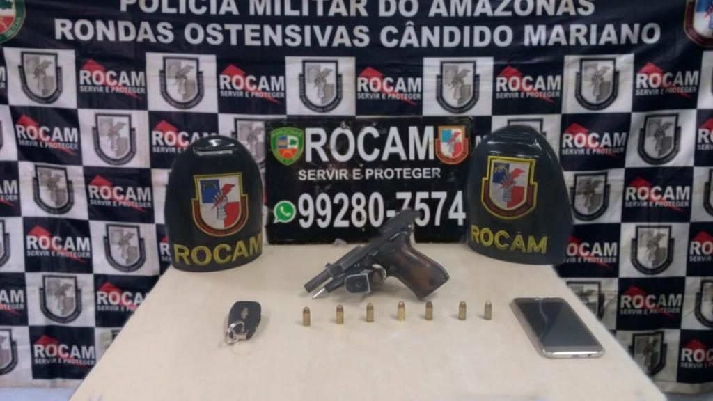 Policiais militares das Rondas Ostensivas Cândido Mariano (Rocam) detiveram, na tarde desta quarta-feira (05/02), dois homens suspeitos de porte ilegal de arma de fogo em um condomínio na Ponta Negra, zona oeste da capital. Com os suspeitos, os policiais apreenderam uma pistola calibre 380, marca Beretta, numeração B30333Y, sete munições calibre 380, intactas e um veículo modelo Onix, placas PHR-4J75.