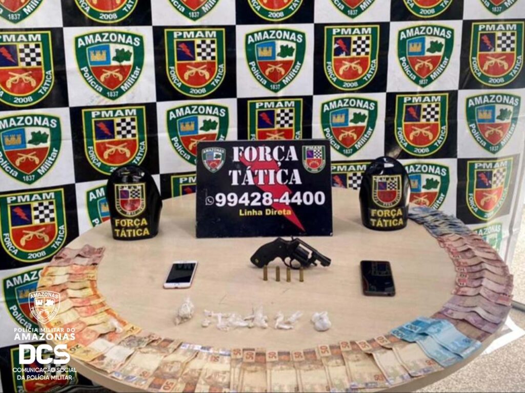Na tarde desta quinta-feira, policiais da Força Tática prenderam um homem de 25 anos, na rua 11, conjunto Hileia, bairro Planalto, zona oeste de Manaus. Após abordagem, a guarnição encontrou com o suspeito um revólver calibre 38, quatro munições intactas, 14 pedras de oxi e cerca de R$ 1,2 mil em espécie. O infrator foi levado ao 19º Distrito Integrado de Polícia (DIP).