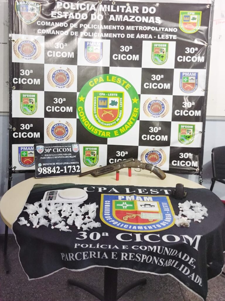 Por volta das 21h, de sábado (13/11), policiais militares atuando na Ação Pacificador, na área da 30ª Companhia Interativa Comunitária (Cicom), prenderam um homem, de idade não informada, com entorpecentes e uma arma de fogo com munições, na rua P, Conjunto Santa Inês, bairro Jorge Teixeira, zona leste da capital.