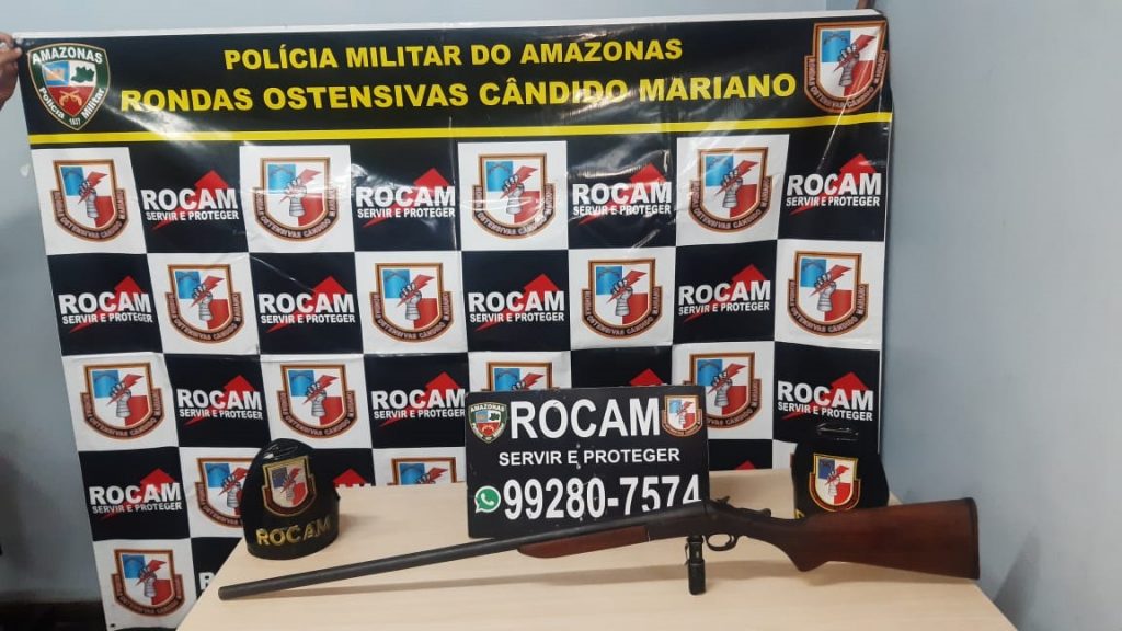 De acordo com a equipe da viatura 2332, por volta de 17h15, por meio do Rocam Denúncia, a guarnição foi informada que um homem estaria em posse de uma arma de fogo do tipo espingarda em sua residência. A equipe se dirigiu ao endereço informado e localizou o suspeito na rua Monte Roraima, no Colônia Terra Nova, e no local ele confessou que guardava a arma.
