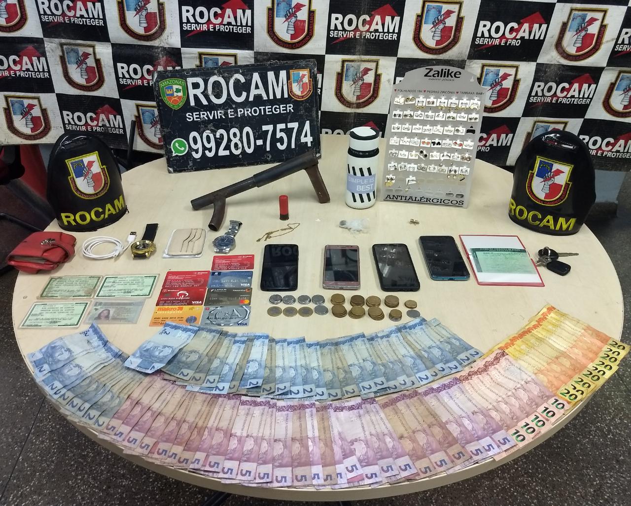 Após intervenção policial, foi feita a abordagem pessoal e no interior do veículo foram encontrados uma arma de fogo de fabricação caseira, calibre 12, uma munição calibre 12, Marca CBC, R$ 447,25 em espécie e quatro celulares.