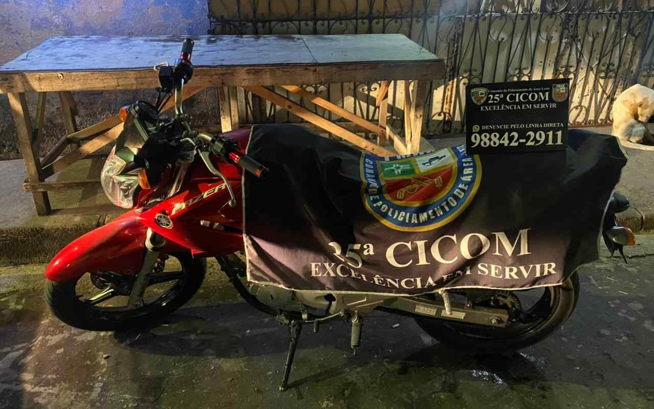 Em outro ponto da cidade, militares da 25ª Cicom localizaram uma motocicleta com restrição de roubo. Durante patrulhamento na rua do Areal, bairro Armando Mendes, ao passar por dois indivíduos em uma motocicleta, percebeu atitude suspeita e efetuou abordagem, durante a qual constataram que a moto, uma Yamaha Fazer 250, de cor vermelha e placa OAJ-0087, tinha restrição de roubo.
