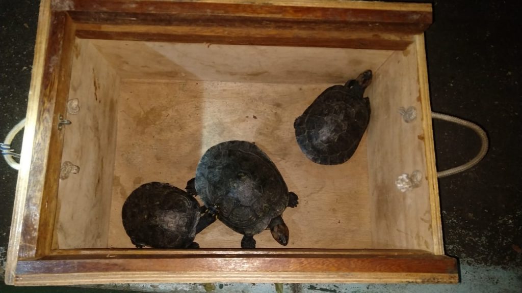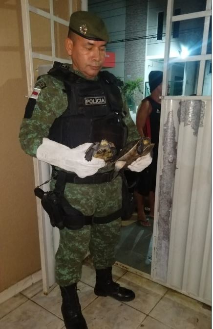 Policiais militares do Comando de Policiamento Ambiental (CPAMB) e do Batalhão de Policiamento Ambiental (BPAMB) resgataram, na noite desta segunda-feira (26/08), três quelônios que estavam em uma residência no bairro Planalto, zona centro-oeste da capital.
