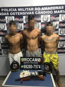 No bairro Colônia Terra Nova, zona norte, militares das Rondas Ostensivas Cândido Mariano (Rocam) prenderam três homens com idade entre 19 e 22 anos que estavam armados e guardavam um veículo roubado na residência deles, após denúncia. Com eles, foi encontrada uma espingarda calibre 12, uma motocicleta Honda CG Fan e placa NPB 9840 com restrição de roubo, além de 23 trouxinhas de maconha, 108 trouxinhas de pasta-base de cocaína, uma balança de precisão e dois celulares.