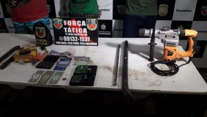 Os cinco integrantes do bando criminoso foram presos com o dinheiro, dois veículos (uma motocicleta e um carro), uma máquina rompedora, uma extensão elétrica, HDs de filmagem, duas malas e uma mochila.