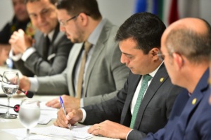 O governador Wilson Lima assinou, nesta segunda-feira (29/04), na sede do Governo do Estado, no bairro Compensa, zona oeste de Manaus, Convênio de Cooperação Técnica com a Defensoria Pública do Estado do Amazonas (DPE-AM) para oferecer assistência jurídica integral e gratuita às forças policiais do Estado. Na ocasião, também assinou mensagem que será enviada para apreciação da Assembleia Legislativa do Estado (ALE-AM) estabelecendo recompensa financeira aos policiais civis e militares que apreenderem armas de fogo ilegais.