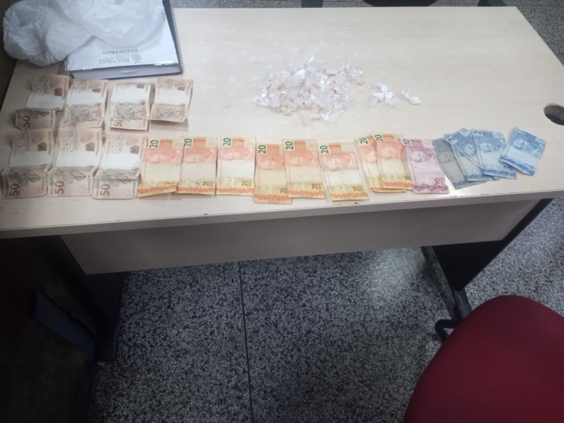 Dinheiro e trouxinhas de drogas apreendidas. (Foto: Divulgação/PMAM)