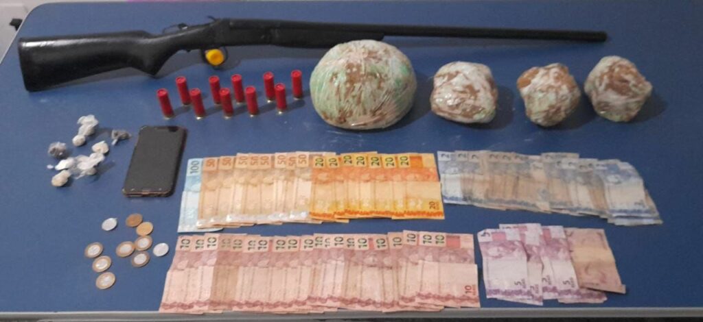 Em seguida, os agentes fizeram uma busca no local e encontraram uma espingarda calibre 12, dez munições intactas, além de 11 pequenas porções de pasta base de cocaína e R$ 932 em espécie. A mulher ainda confessou aos policiais que escondia, em outro lugar, mais porções de entorpecentes. As equipes foram até o local indicado pela suspeita, onde apreenderam quatro porções de drogas, entre pasta base de cocaína e maconha tipo skunk.