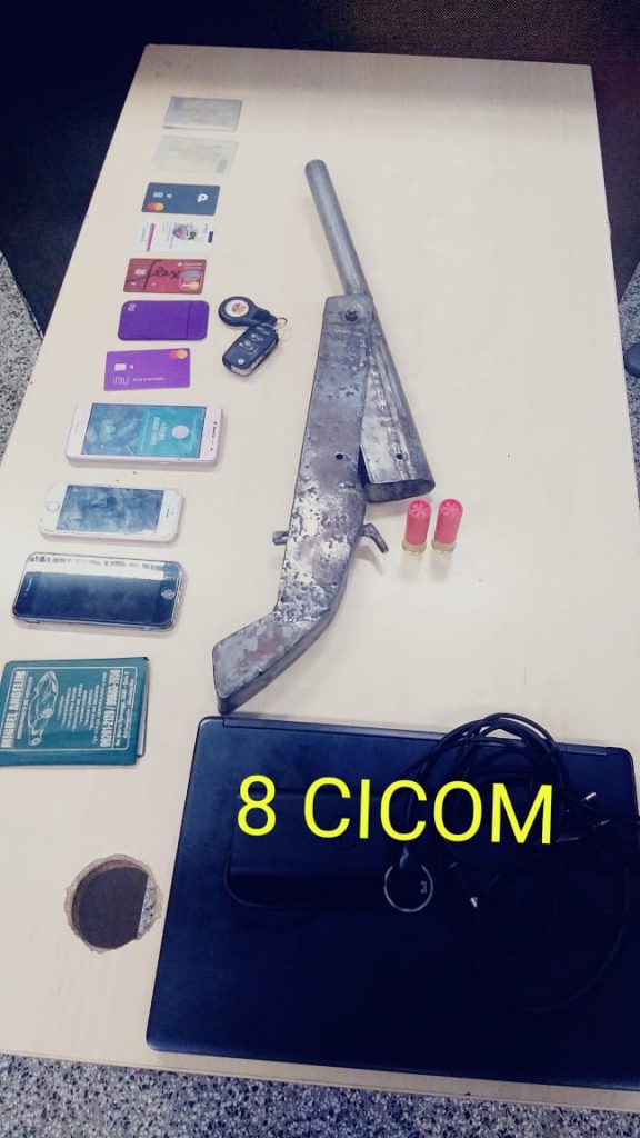 Na ação, além da arma caseira e dos dois veículos, foram apreendidas duas munições intactas de calibre 12, um notebook, dois aparelhos celulares e cartões de crédito