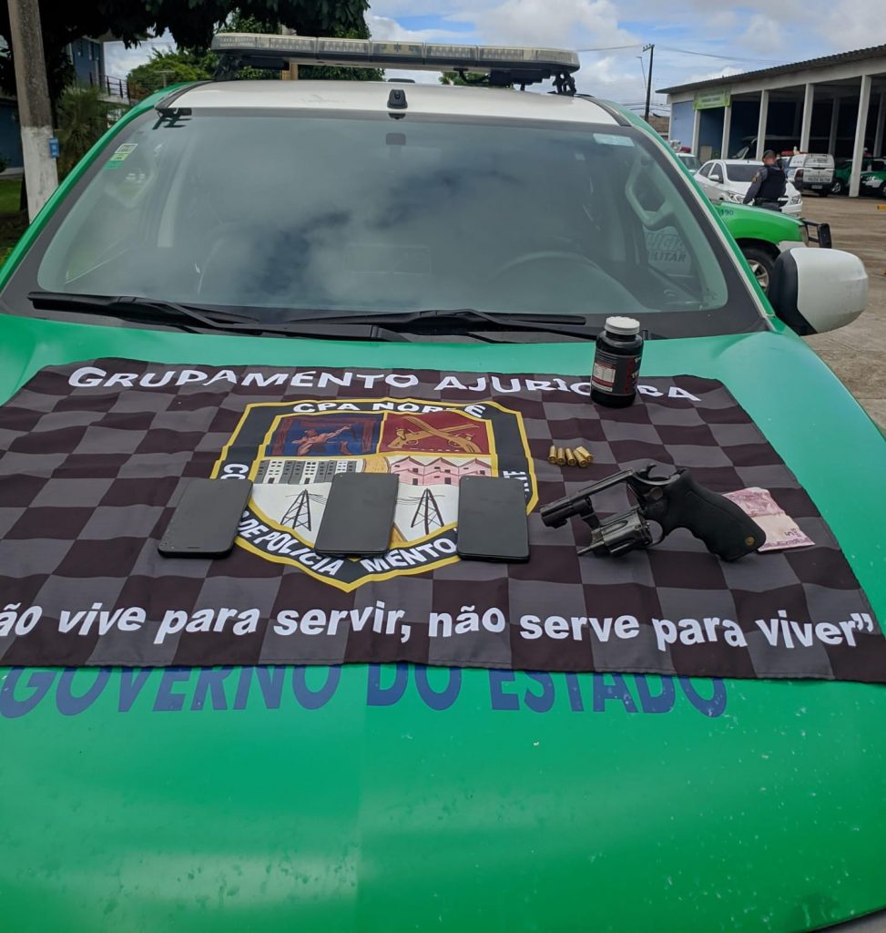 Os policiais foram ao local e perceberam a movimentação do veículo da denúncia. Sendo feita a abordagem, no carro estavam os quatro envolvidos, e com eles foram encontrados quatro aparelhos celulares e uma arma de fogo calibre 38 com numeração intacta.