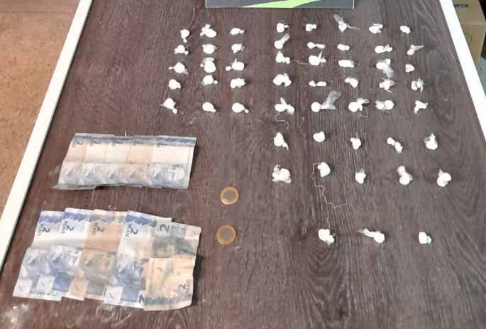 Durante revista pessoal, os policiais encontraram em posse dos jovens 38 trouxinhas de supostamente oxi e 15 trouxinhas de supostamente cocaína, assim como uma balança de precisão e R$ 22,00 em espécie.