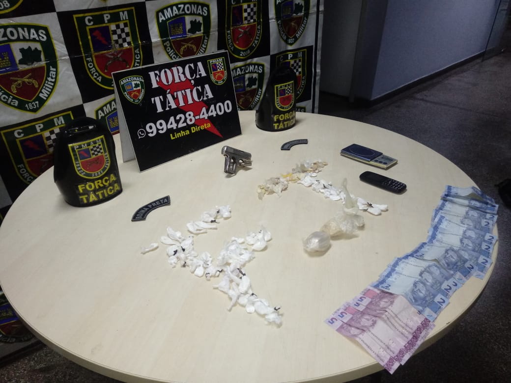 Policiais militares da Força Tática detiveram, na noite desta segunda-feira (06/04), um homem de 29 anos e uma mulher de 23, suspeitos de tráfico de drogas e posse ilegal de arma de fogo, no bairro Alvorada, zona centro-oeste da capital. Com o casal, os policiais apreenderam uma pistola calibre 22, 32 trouxinhas de supostamente oxi, 68 trouxinhas de supostamente cocaína, uma porção média de supostamente cocaína, duas pedras médias de supostamente oxi, uma balança de precisão, um aparelho celular e a quantia de R$ 42,00 em espécie.